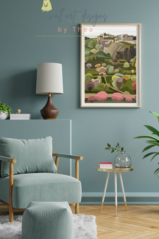 A3 Edinburgh Castle and Princes Street Gardens -unframed quality card print. Scottish landmarks