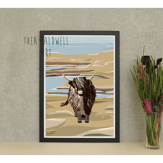 A3 Black Highland Cow -unframed quality card print. Scottish landmarks